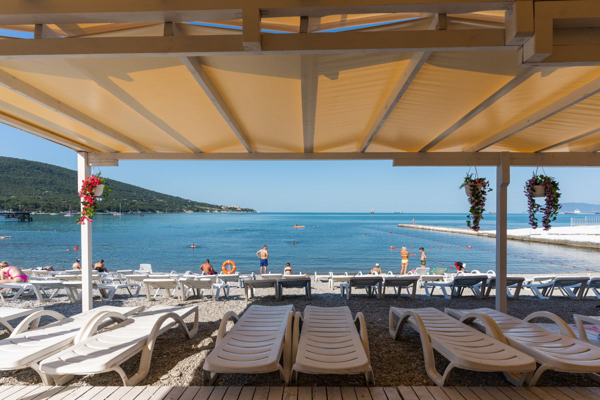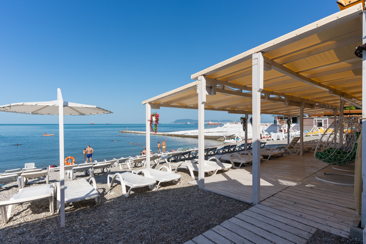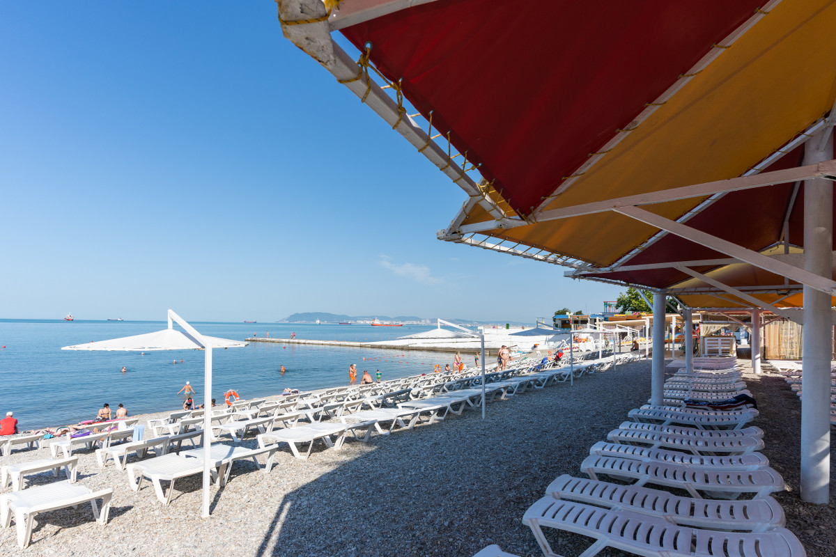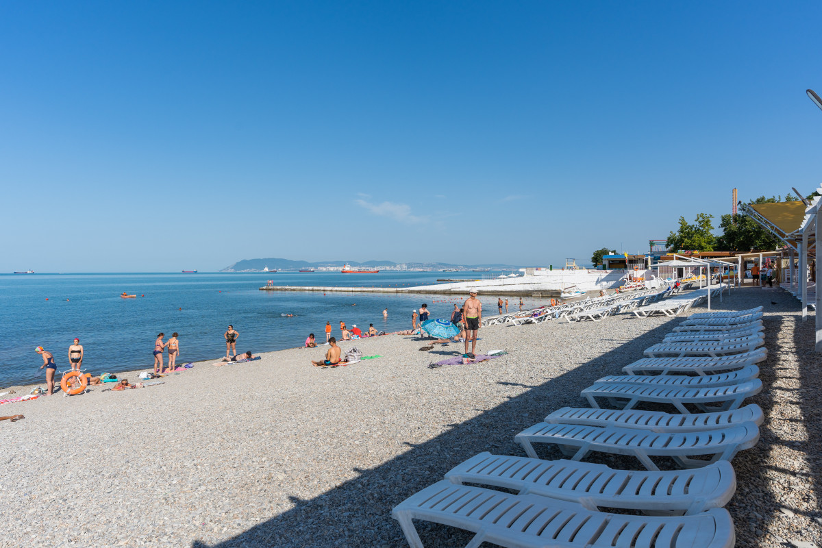 50 м (собственный, галечный, бесплатные лежаки, есть прокат пляжного и спортивного инвентаря, душ, медпункт)